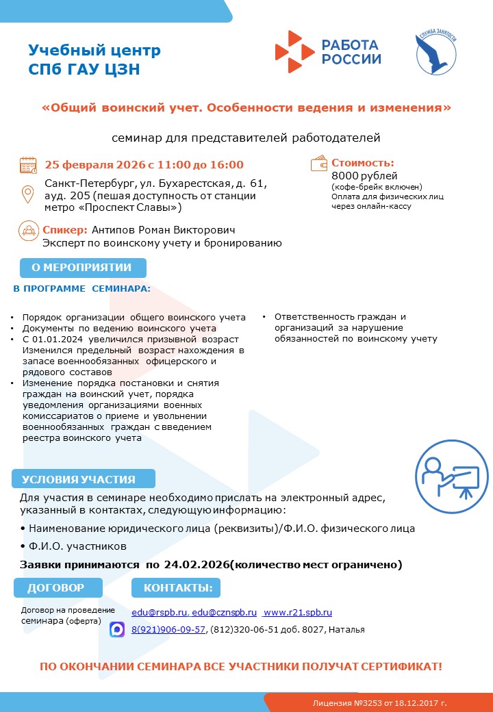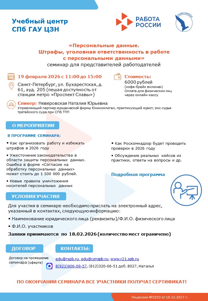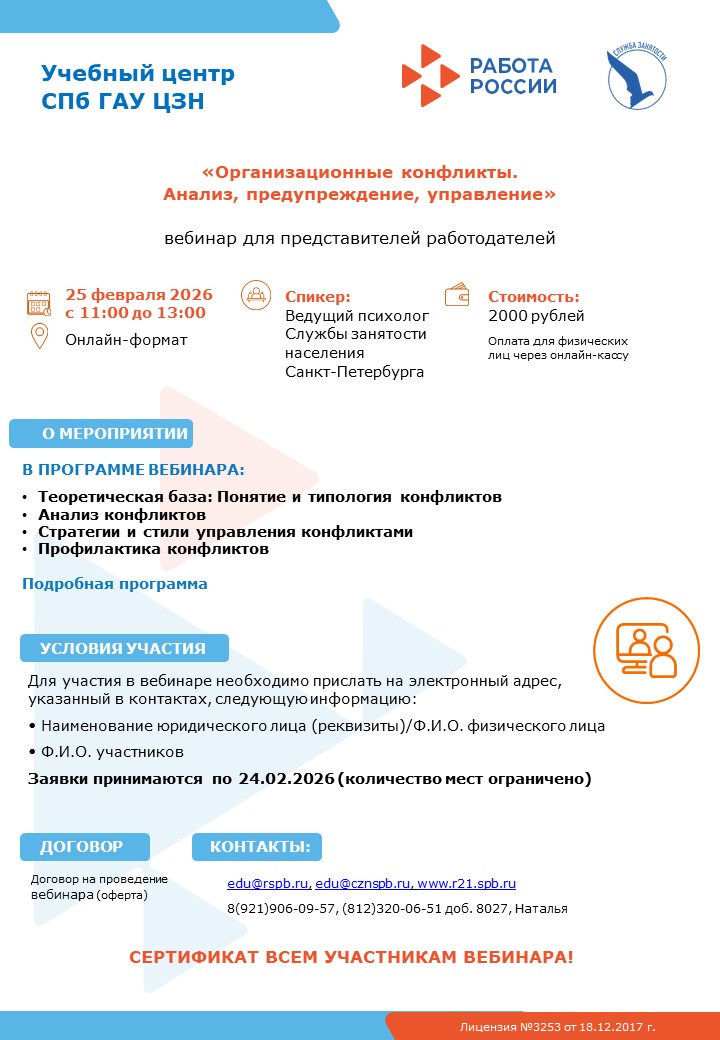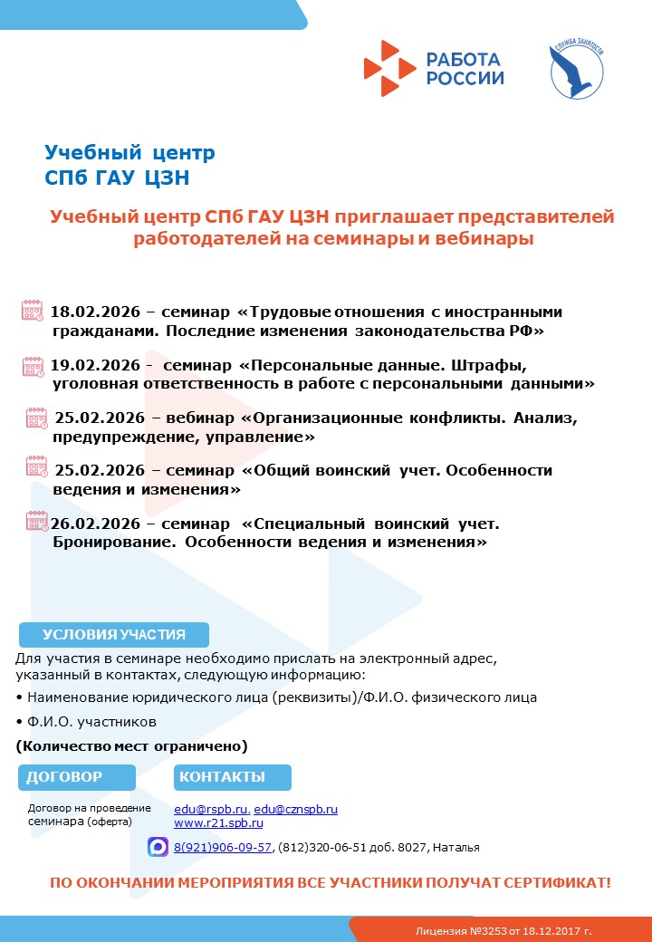 Учебный центр СПб ГАУ ЦЗН приглашает представителей работодателей на семинары и вебинары:
