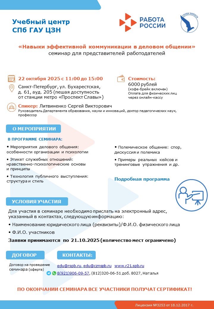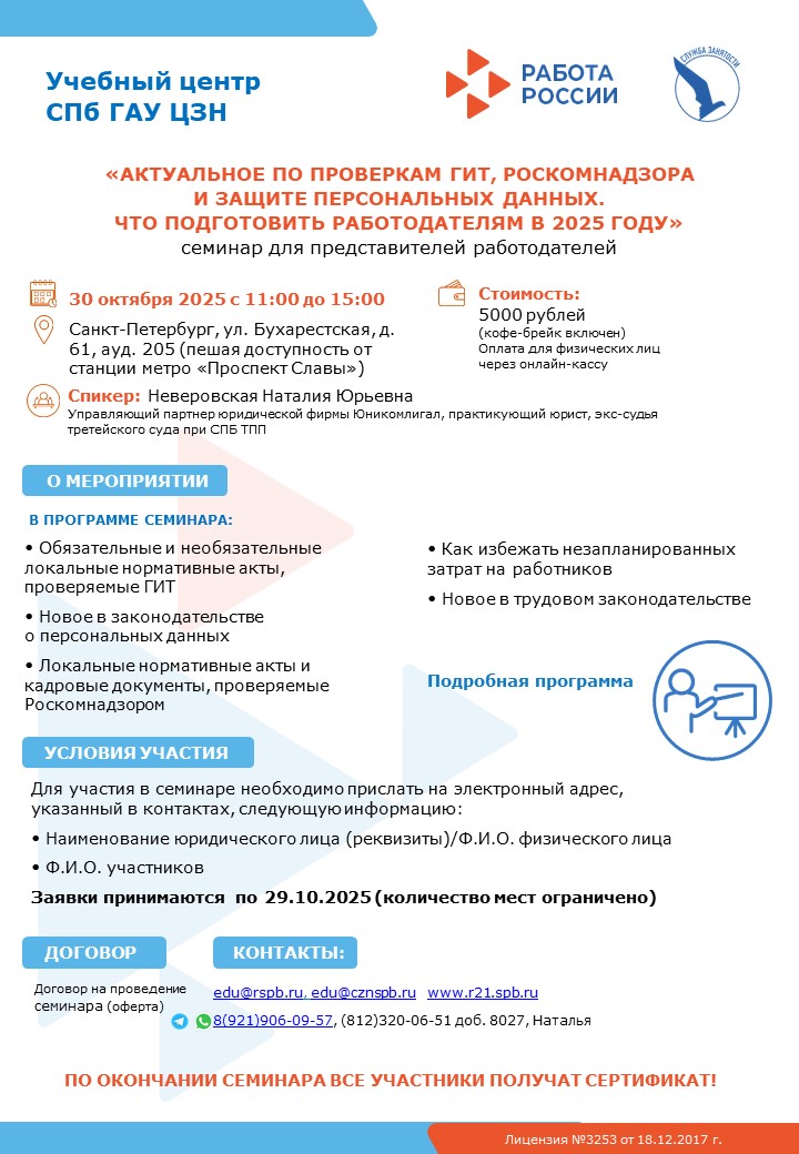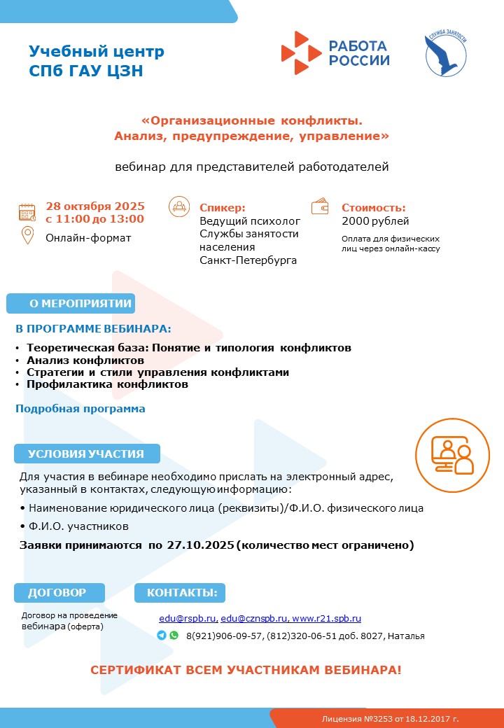 Учебный центр СПб ГАУ ЦЗН (экспертная площадка) организует и проводит платные семинары, вебинары и курсы повышения квалификации для работодателей на актуальные темы: